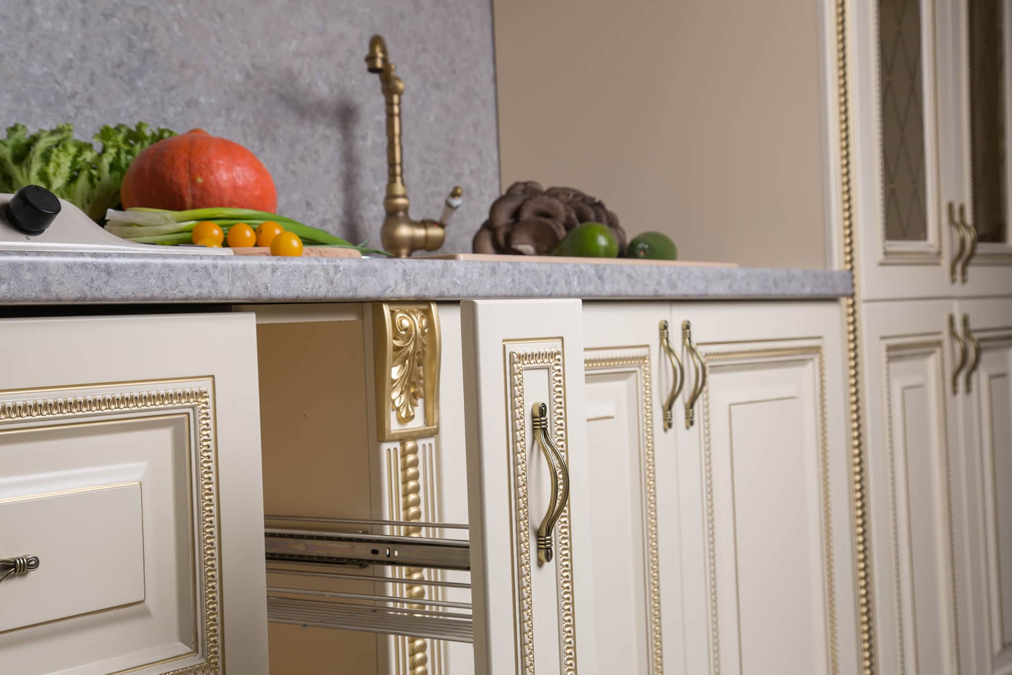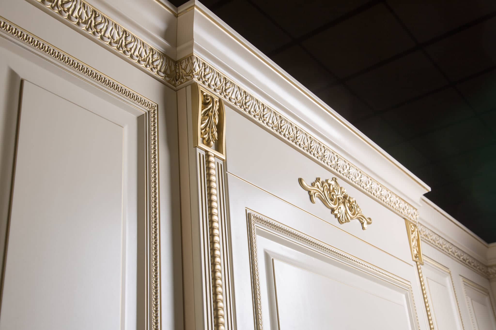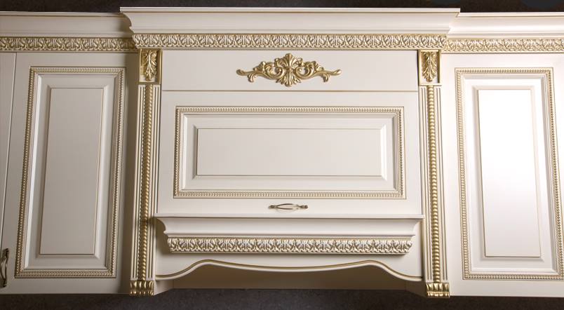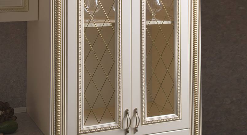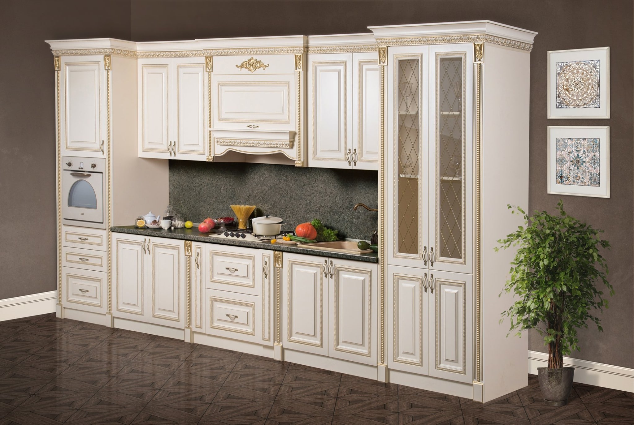 | Фасад | прямой, крашеный ЛМДФ толщиной 19мм с фрезеровкой и элементами декора, лак матовый, карниз из пенополиуретана |